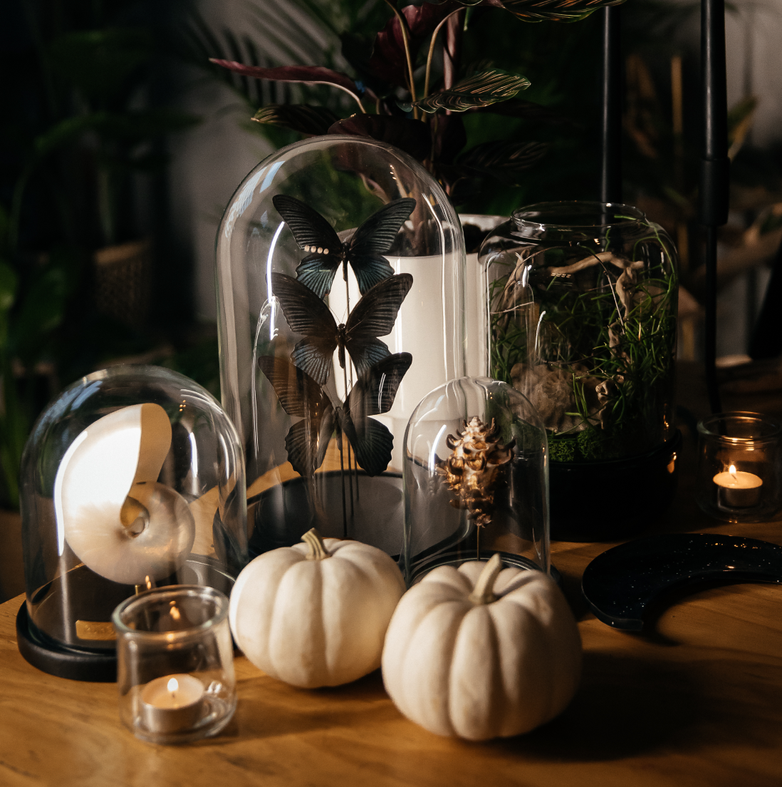 в тыкве и зелёный террариум с окаменелым аммонитом.