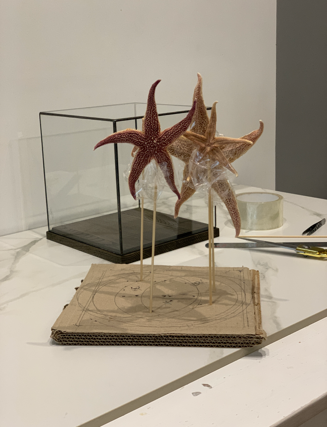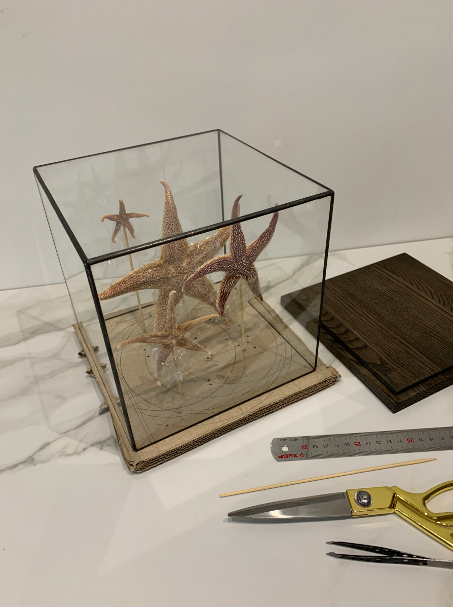 Когда все элементы подготовлены, мы создаем «черновик» композиции. Размещаем предметы так, как они будут наиболее выигрышно выглядеть в витрине. Далее, монтируем звезды на латунные стержни, переносим их на подставку, проверяя как это выглядит